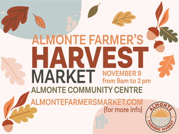It’s our 6th Harvest Market, and the market will be packed with all of your favourite regular vendors plus a number of guest vendors! Hot breakfast and lunch choices will be plentiful! Nick will be ready to sharpen your knives and tools! There will be fresh organic produce, a variety of locally and organically grown meats, Back 40 Sheep’s Cheese, Harwood Estates Winery, ferments, hot sauce, herbal remedies and body products, functional pottery, maple syrup and honey….plus lots of gift ideas! Check out the postcard for where and when!